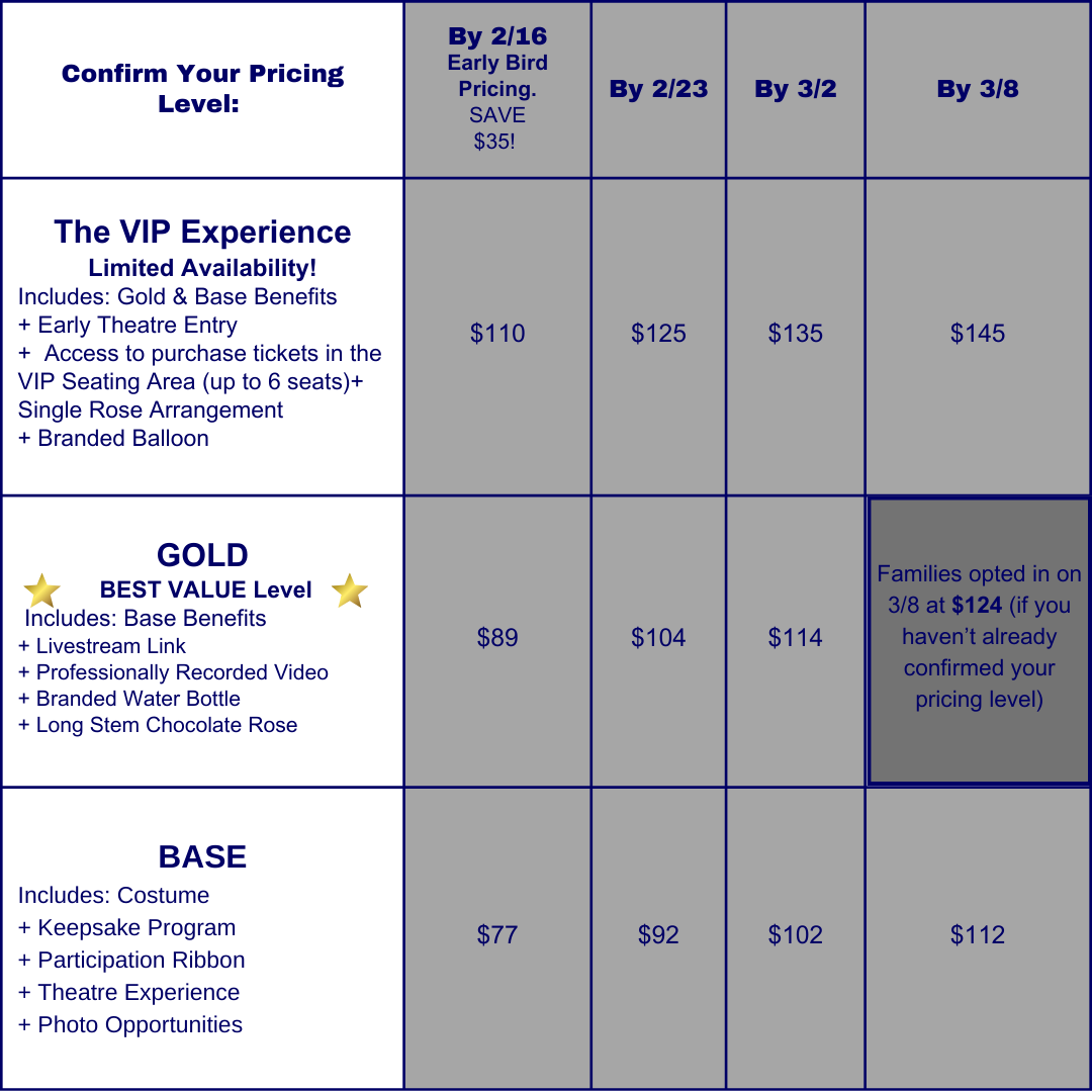 Click HERE to confirm your choice and pricing level for our 2025 Recital!